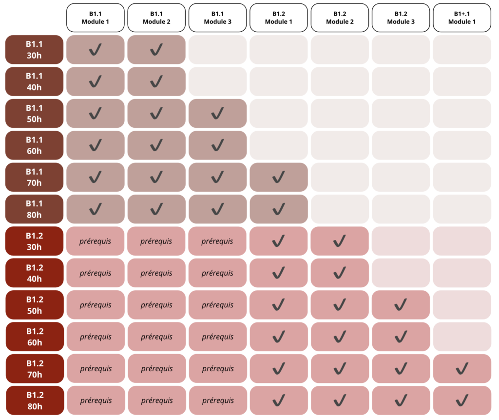 Les formations de niveau B1 nécessitent au moins la maîtrise préalable des compétences de niveau A2. Le passage d’un test de positionnement en visio-conférence est obligatoire afin de valider l’entrée en formation.